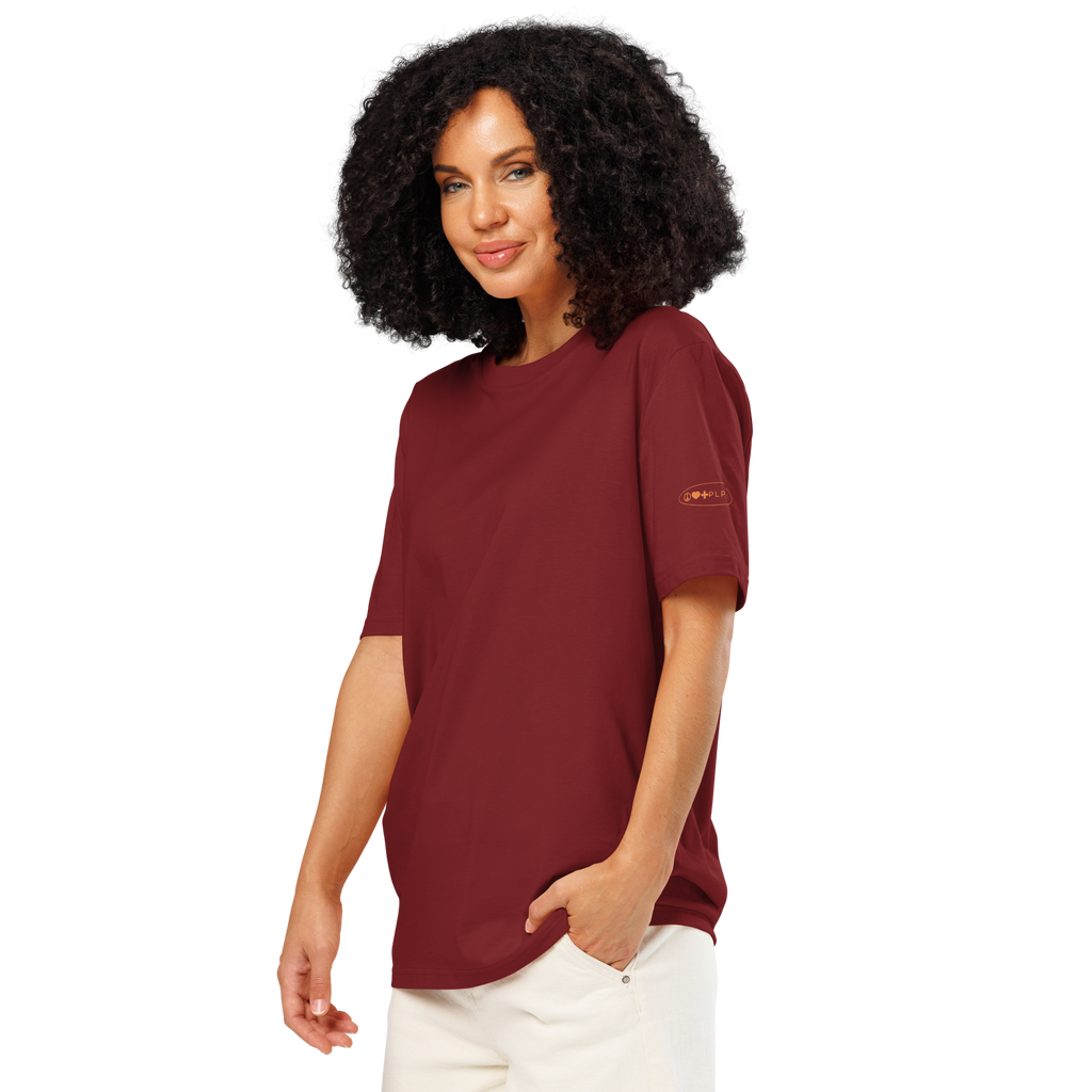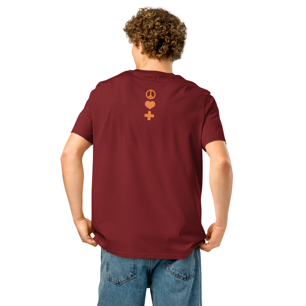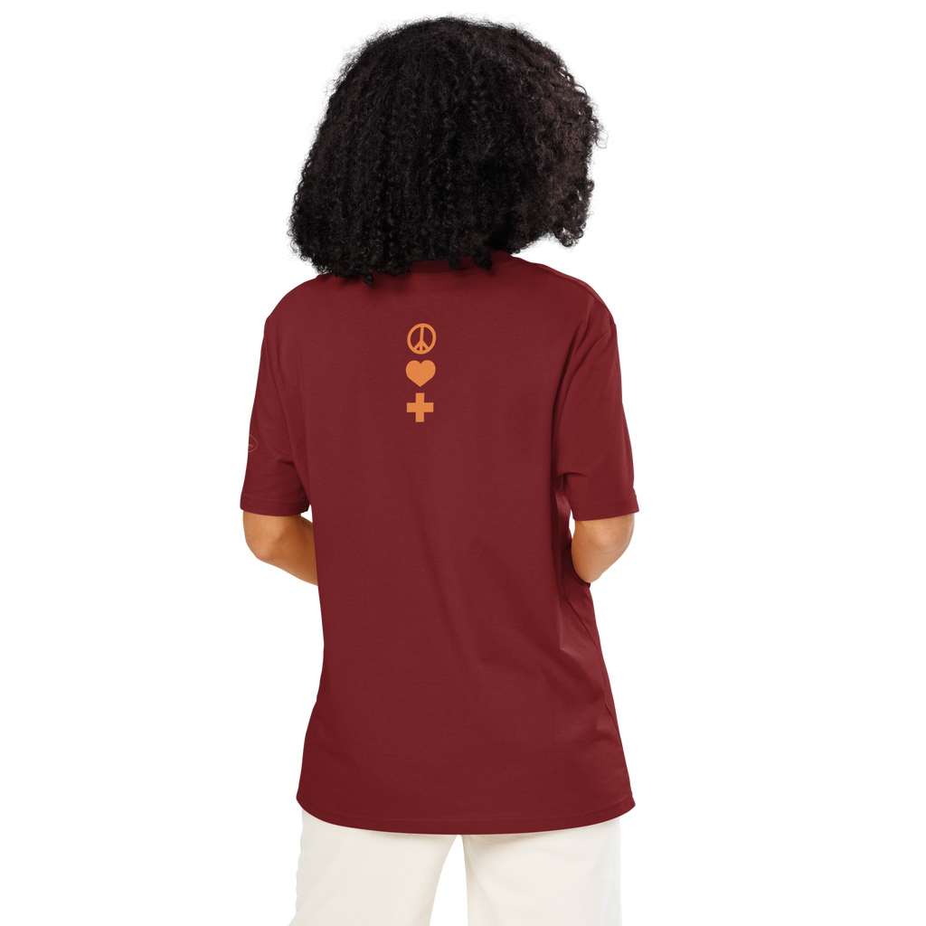 This burgundy organic tee draws from clay, soil, and deep rainforest tones. Featuring subtle symbol placement down the spine, it bridges global streetwear with eco-conscious simplicity. For those who want to root themselves in Peace, Love & Positivity.
